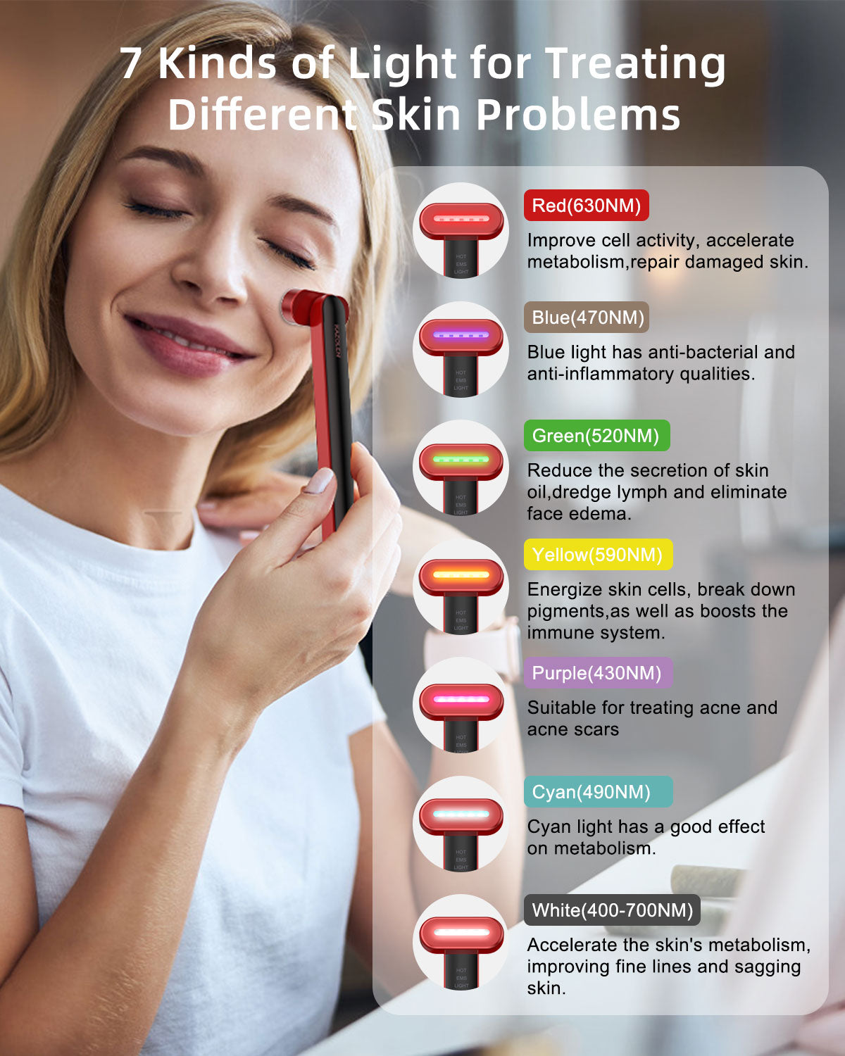7 in 1 Skincare Wand:Red Light(630nm), Green Light(520nm), Blue Light(470nm), Yellow Light(590nm), Purple Light(390nm), Cyanine Light(415nm-520nm), White Light. 7 colors of light are suitable for different skin types, both men and women can use it.